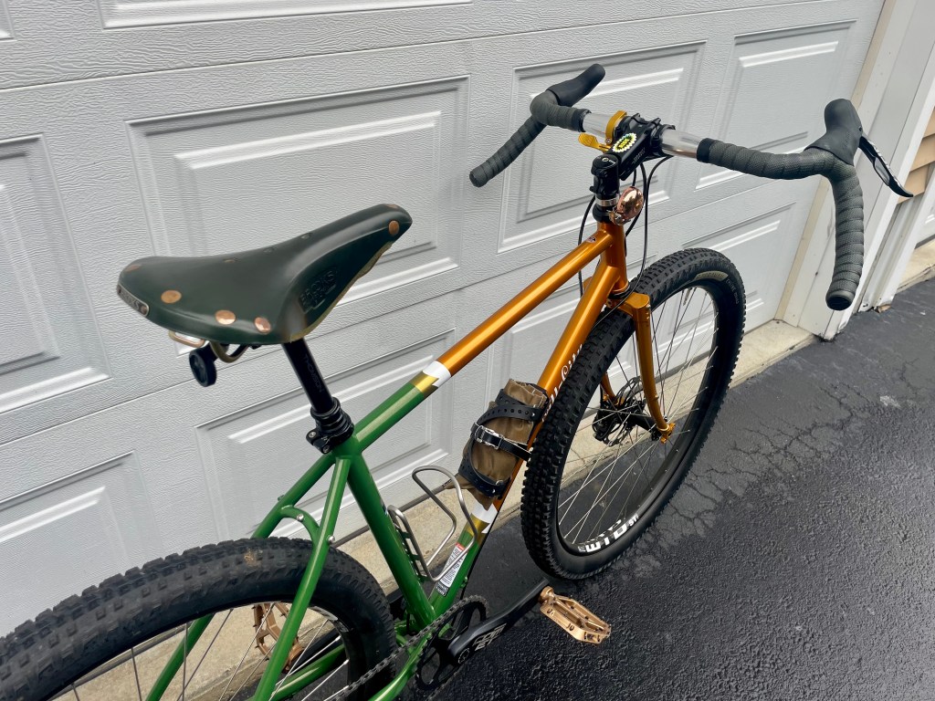 I have (mostly) been enjoying my All-City Gorilla Monsoon. UNFORTUNATELY, the handlebars, and dropper trigger, were really a bit of a thorn in my side. I did some looking about, came up with a plan, and installed some new Daija Works Far-BArs, a Paul 31.8 Dropper Trigger and a Crane Suzu Bell on my Gorilla Monsoon. I wrapped the bars in some Brooks green cadmium bar wrap to finish them off. I found the bars at a local swap meet near me In providence for $15 which was great, except that they were silver and not black, which would have been my preference.