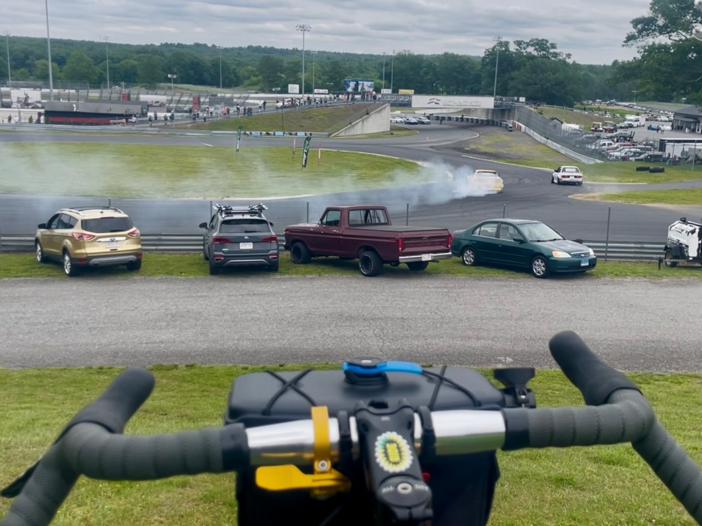 I rode up the trail until I jumped off at Thompson road in Thompson, CONNECTICUT after hearing the sounds of motors and tirs screeching. I found Thompson Speedway was having a drift event, so it was a good excuse to have a snack and drink, as well as spectate as well.